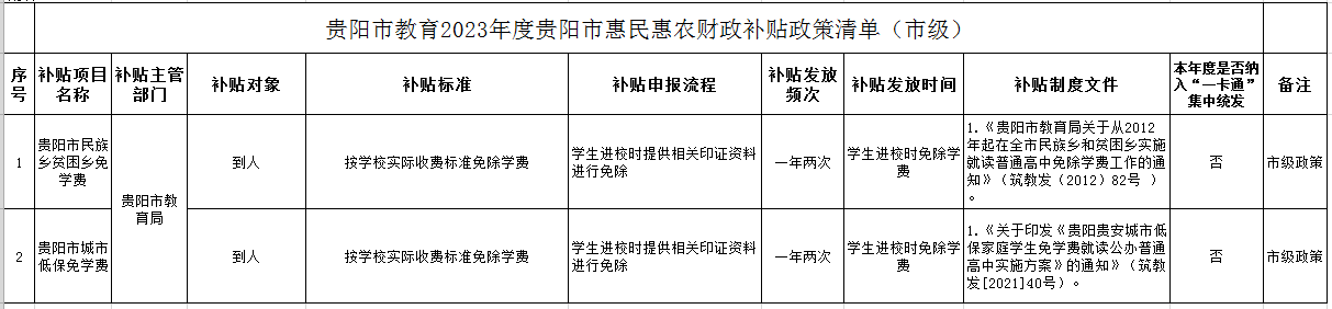 贵阳市教育2023年度贵阳市惠民惠农财政补贴政策清单(市级)