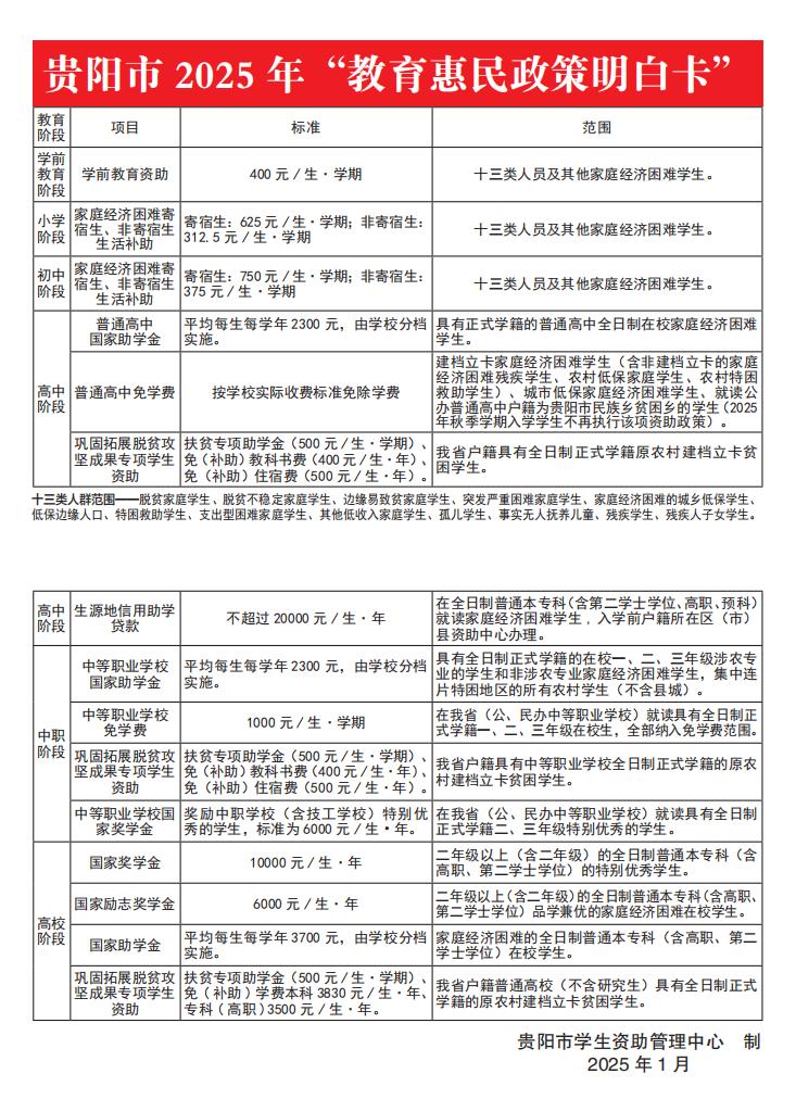贵阳市 2025 年“教育惠民政策明白卡”