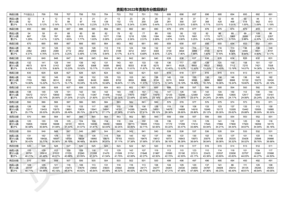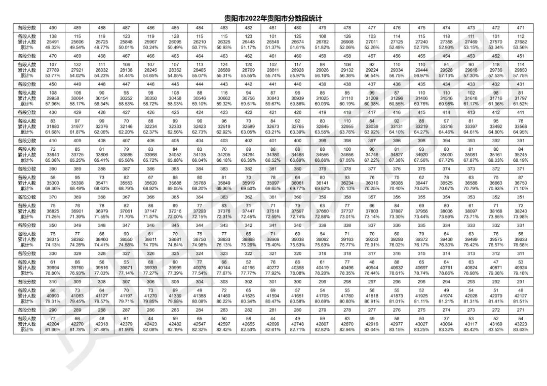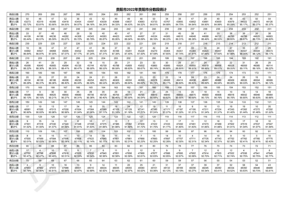 贵阳市2022年中考成绩分数段统计表