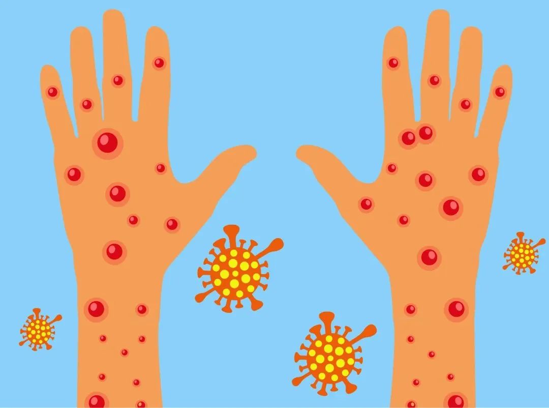 皮疹经历从斑疹、丘疹、疱疹、脓疱和结痂几个阶段,不同形态的皮疹可同时存在。疱疹和脓疱疹多为球形,直径约 0.5~1厘米,质地较硬,可伴明显痒感和疼痛。疱疹数量从几个到数千个不等,多呈离心性分布。可累及口腔黏膜、消化道、生殖器、结膜和角膜等。病程约 2~4 周。