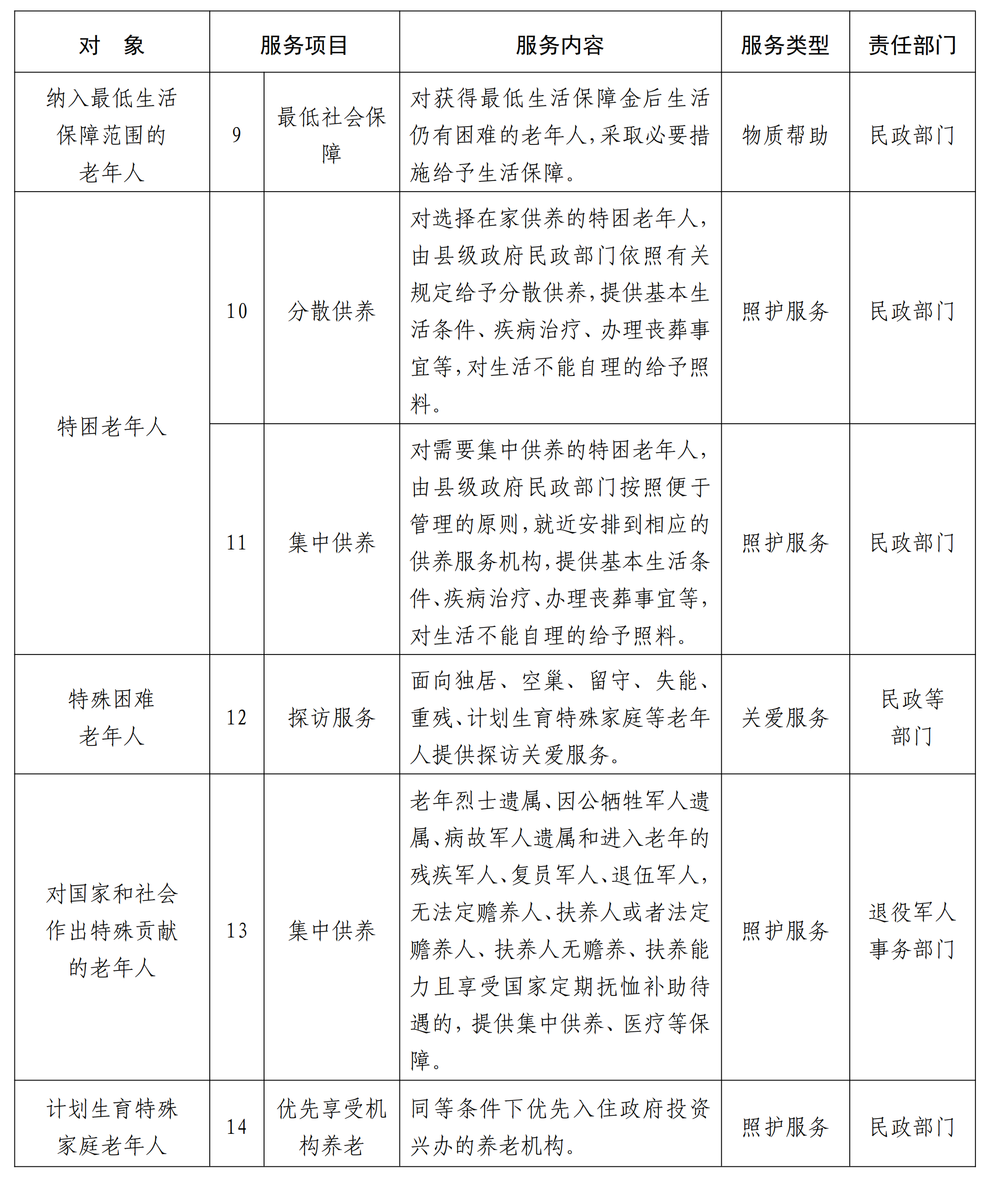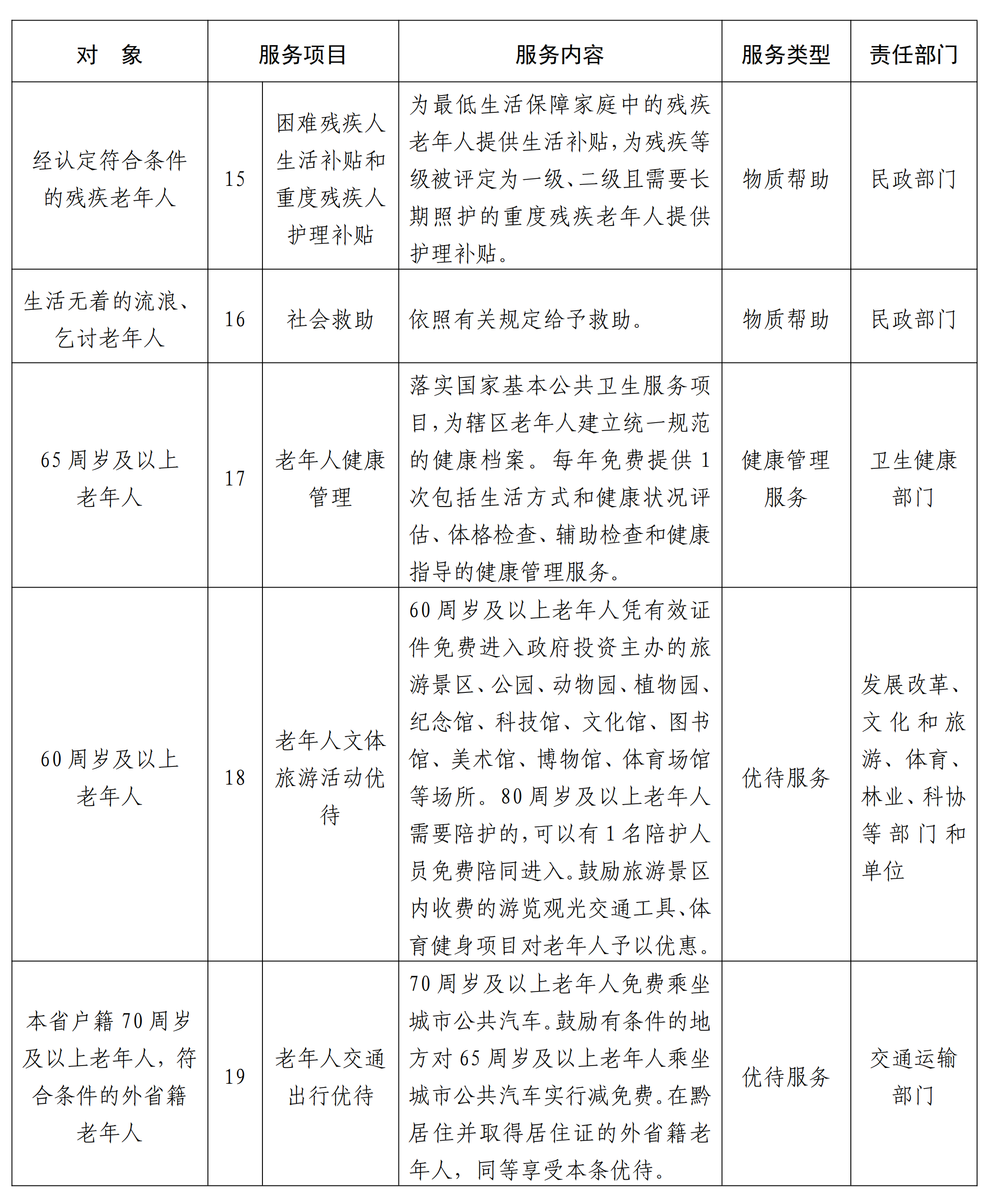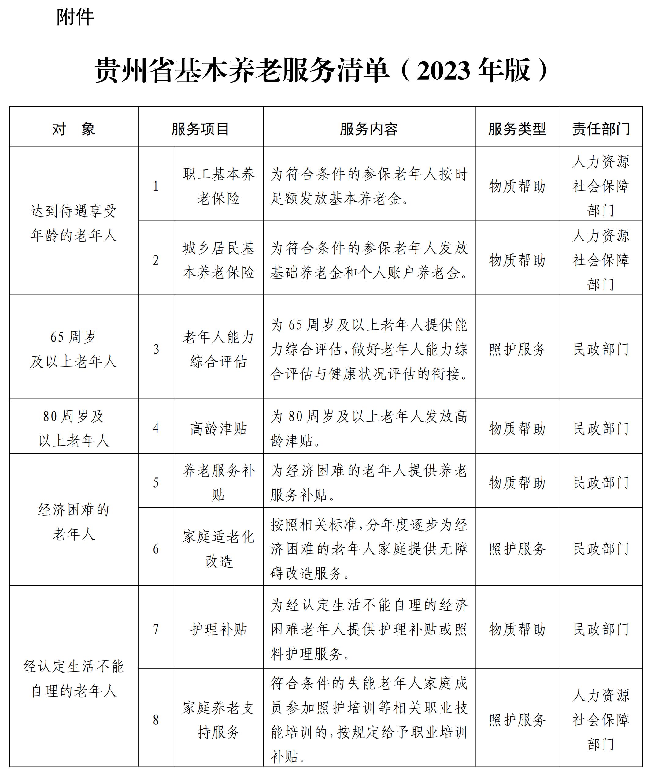 1.制定落实基本养老服务清单。省级对照《国家基本养老服务清单》,制定公布《贵州省基本养老服务清单》,服务项目、覆盖范围和实现程度不低于《国家基本养老服务清单》要求。各地各有关部门要严格落实《贵州省基本养老服务清单》。具备条件的市(州)、县(市、区、特区)可结合当地老年人服务需求、财政承受能力、可持续性等因素适当拓展服务内容,制定本地区基本养老服务清单,并报上一级人民政府备案。(责任单位:省民政厅,各市〔州〕、县〔市、区、特区〕人民政府。以下任务责任单位均包含各市〔州〕、县〔市、区、特区〕人民政府,不再列出)