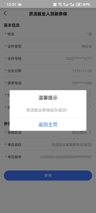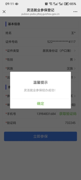 4.点击“参保”,系统温馨提示“灵活就业参保经办成功!”。