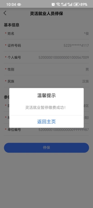 4.点击“停保”,系统温馨提示“灵活就业暂停缴费成功!”。