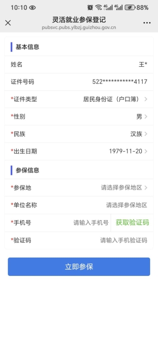 5.选择常住地参保地区,输入手机号获取验证码并输入手机验证码,点击“立即参保”。