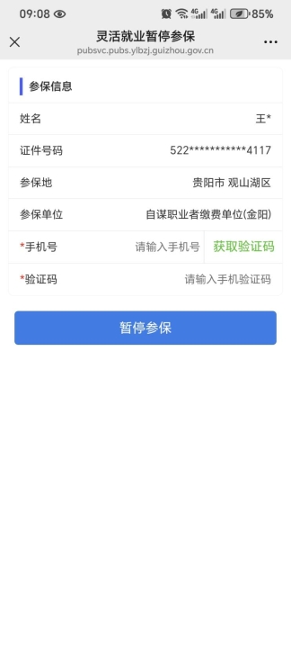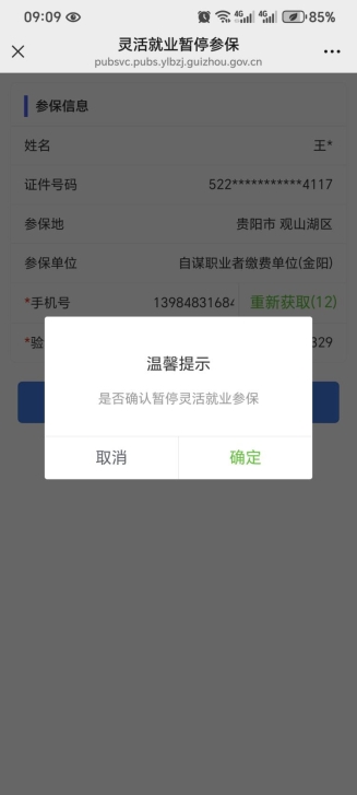 5.输入手机号获取验证码并输入手机验证码,点击“暂停参保”。显示温馨提示“是否确认暂停灵活就业参保”,点击“确定”。