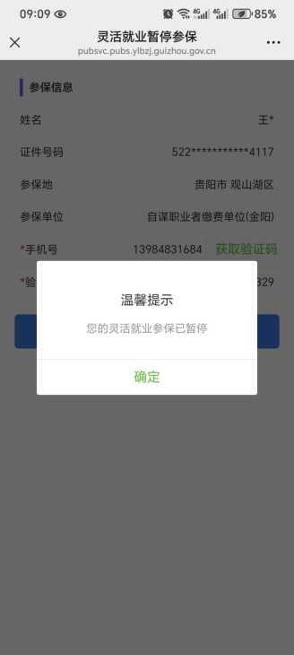 6.显示温馨提示“您的灵活就业参保已暂停”,点击“确定”。