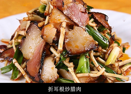 腊肉300克,折耳根150克,芫荽(香菜)50克,香葱25克,青、干辣椒各25克,料酒5克,花椒15粒,白糖5克,食盐3克,混合油30克。