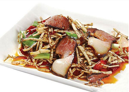 (6)最后在锅中放入折耳根小段、腊肉片,调入酱油和鸡精,继续翻炒约3分钟即可。
