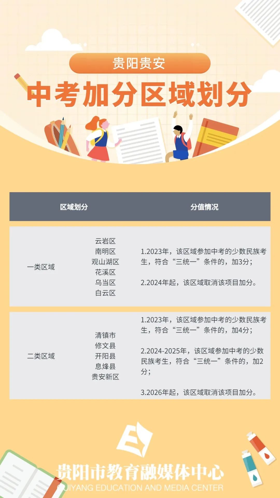 一类区域:云岩区、南明区、观山湖区、花溪区、乌当区、白云区。2023年,该区域参加中考的少数民族考生,符合“三统一”条件的,加3分;2024年起,该区域取消该项目加分。