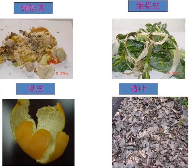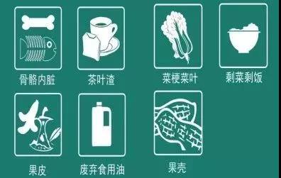 易腐垃圾:米面肉类、蔬菜果壳类、食品类、其他类(茶叶渣、甘蔗渣、中药渣、家用盆景、植物残枝落叶等)。