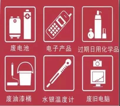 有害垃圾:电池类、废电子产品、废旧灯管灯泡、废弃水银温度计血压计、废油漆及其包装物、废矿物油及其包装物、废杀虫剂及其包装物、废药品及其包装物等。