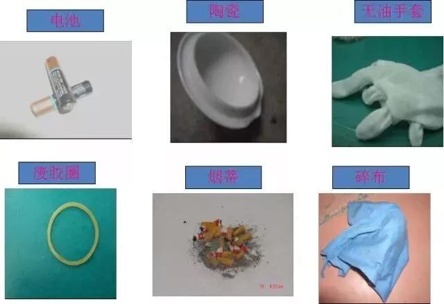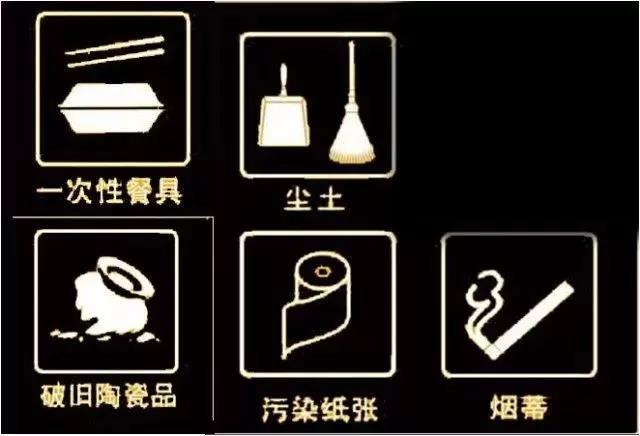 其他垃圾:受污染与无法再生的纸张、烟蒂、渣土灰尘、陶瓷制品、普通一次性电池、受污染的一次性用具、保鲜袋(膜)、妇女卫生用品、海绵、受污染织品。