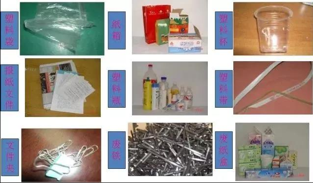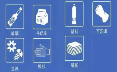 可回收物:纸类、金属类、塑料橡胶类、玻璃类、除塑料袋外的塑料制品、织物类、牛奶盒等利乐包装盒等。