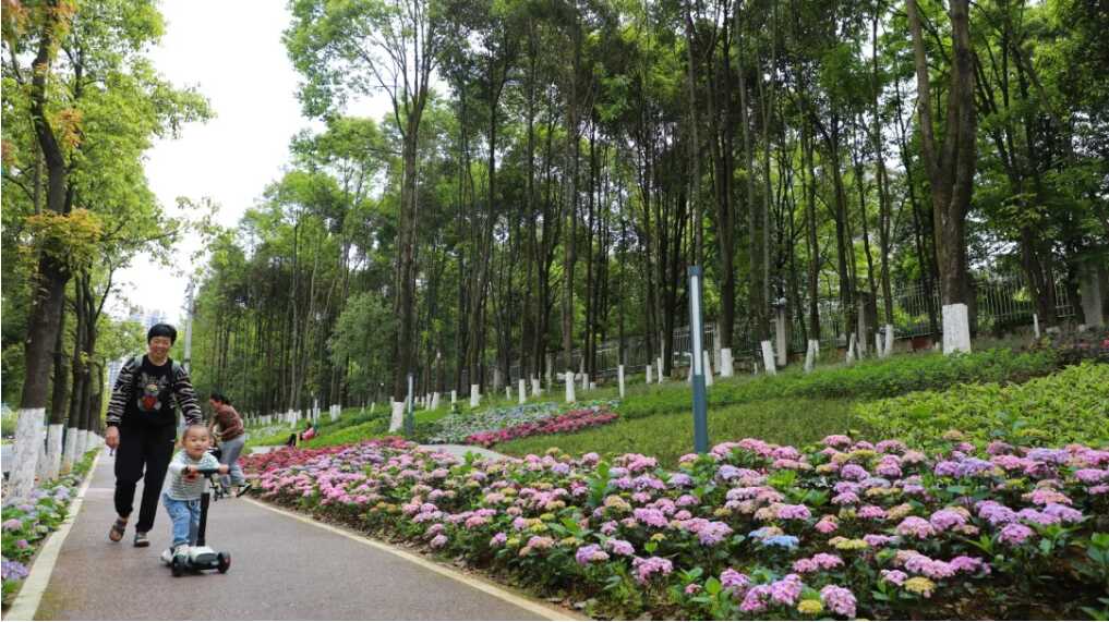 “以前,这里只有一条健身步道,缺少停留空间和休息点。”王兴说,在这栽种大片的绣球花,更多是考虑到附近居民多为“有老有少”的家庭群体,希望居民们在晨练或者夜晚纳凉时,有多维度的绿化景观体验,实现“300米见绿、500米见园”。