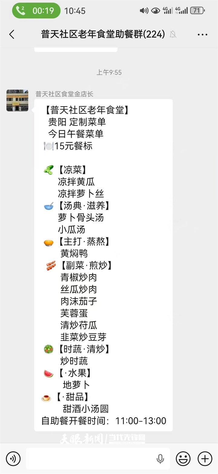 10月3日,普天社区老年食堂发布在微信群的自助餐菜单。