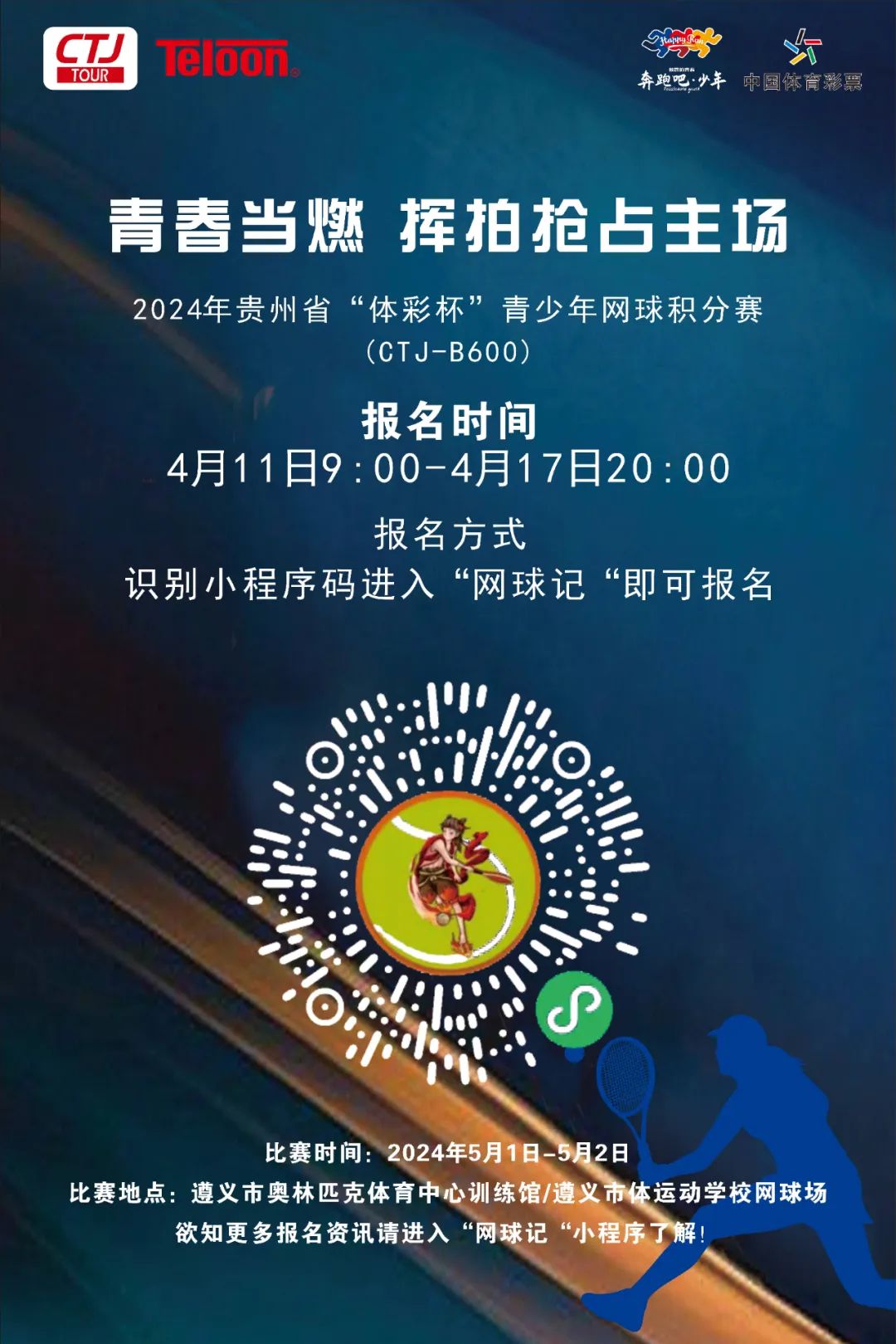 2024年贵州省“体彩杯”青少年网球积分赛(CTJ-B600)第1站将于2024年5月1日-5月2日在遵义市奥林匹克体育中心训练馆/遵义市体育运动学校网球场举行,扫描上方二维码进入报名页面,赛事报名时间4月11日9:00-4月17日20:00。