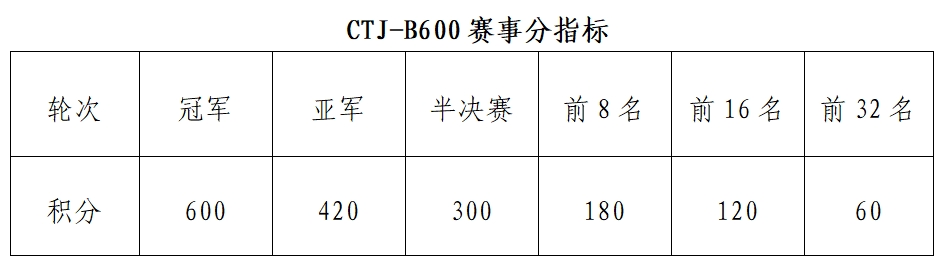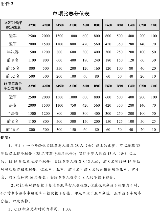 CTJ积分赛实际参赛人数在32人以上的,前32名可获得相应积分;实际参赛人数在16-31人的,前16名可获得相应积分;实际参赛人数在8-15人的,前8名可获得积分;实际参赛人数少于8人的不授予积分。(积分录入统计和授予以中国网球协会最终确认的为准)