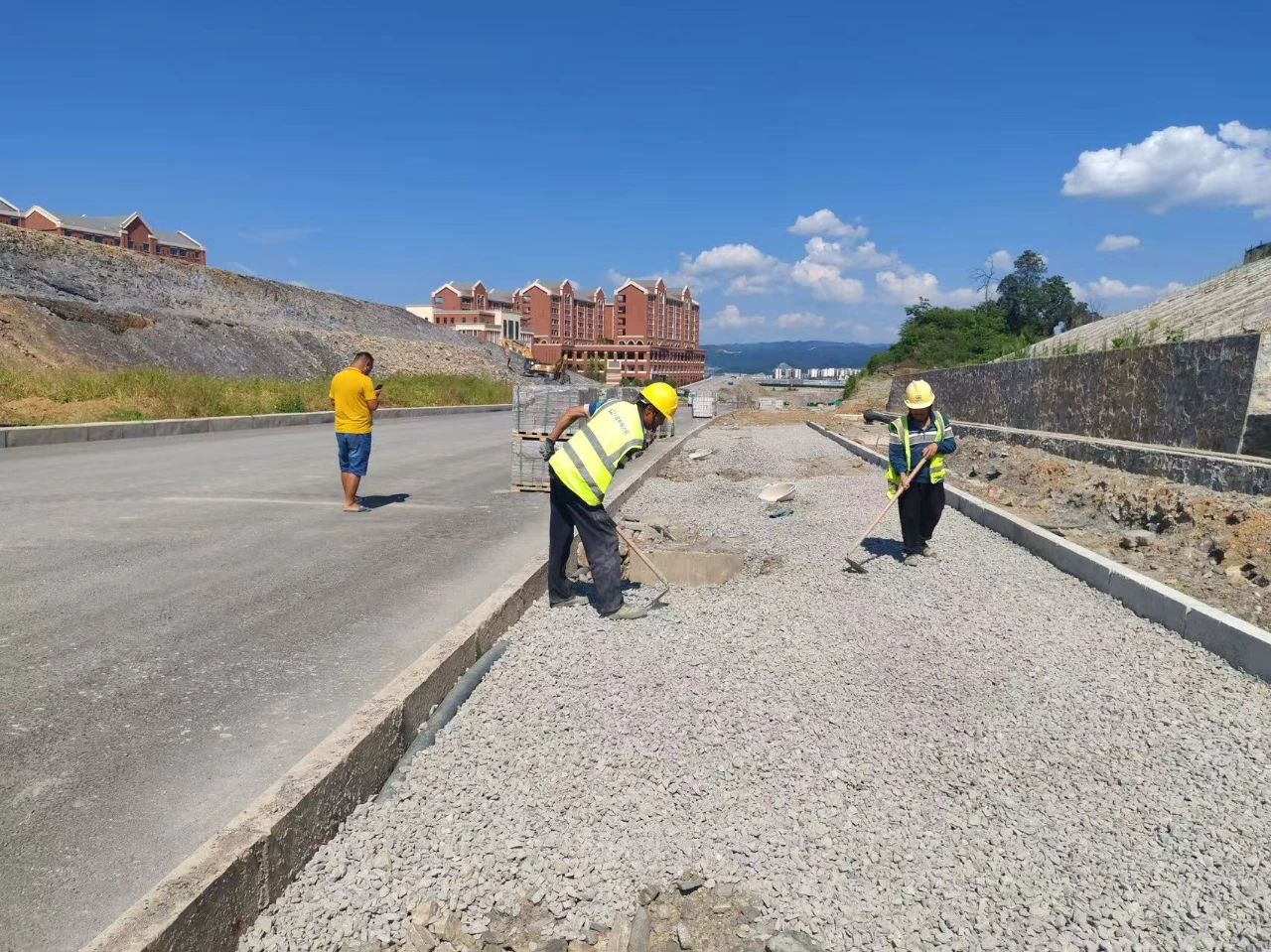 8月5日上午,贵阳市智圣中学门前的双龙北线(西段)工程建设现场,数十名工人正忙着铺设人行道、修建护坡及排水渠。