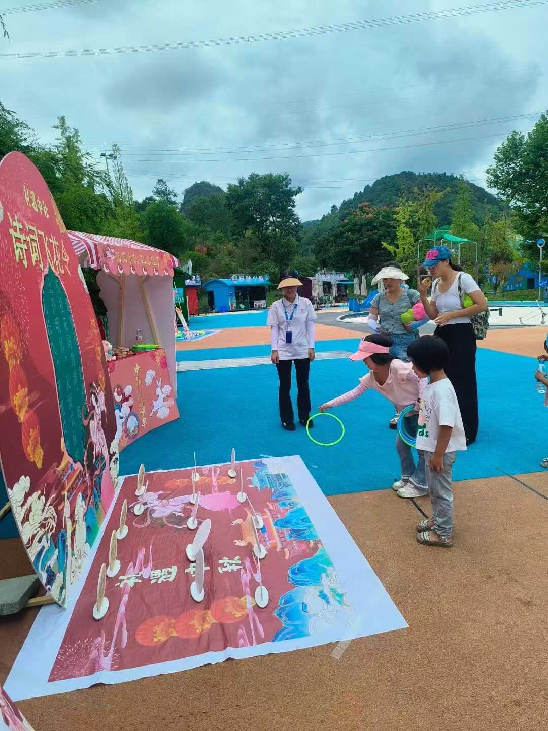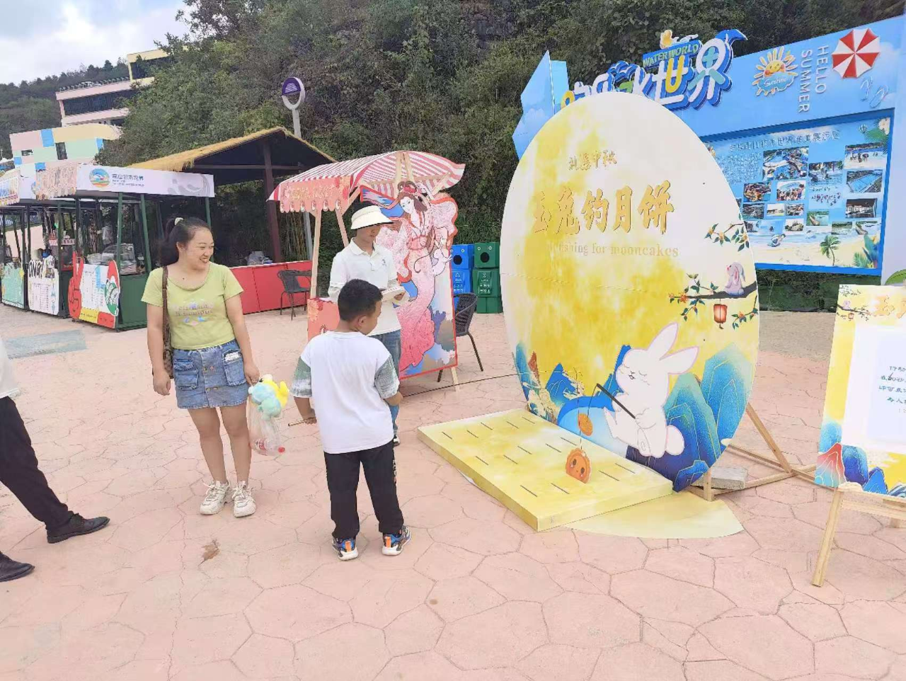 在南山积木世界景区,精彩的水乐园舞台DJ、MC及舞蹈表演与现场互动传统博饼活动结合在一起,游客互动性、娱乐性进一步提升。景区还开展了中秋灯谜、玉兔拔萝卜、后羿射日、玉兔钓月饼、诗词飞花令、套圈圈、好运连连射等互动游戏,为游客带来不一样的中秋体验。