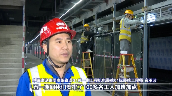中铁建设集团贵阳轨道S1线一期工程机电装修01标装修工程师 官承波:“五一”期间我们安排了100多名工人加班加点完成了标段8个车站站台门体安装,目前工人正在进行门体调整和线缆敷设,为下一步的全线联调联试做好准备。