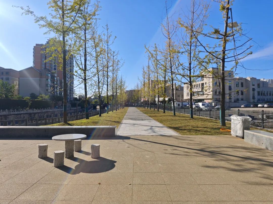 据了解,百花桥头游园处于清镇市城区中心位置,人流量较大,是连接百花桥至北门桥之间的主要人行通道,长约270米,宽约17米,总面积约4000平方米。建设内容包括花池、铁艺围栏、照明系统、给排水系统、道路铺装及植物景观等,植物景观最为亮眼的便是银杏大道,在丰富景观层次的同时,灿烂的金黄色也给游园增添了一抹浪漫和惬意。