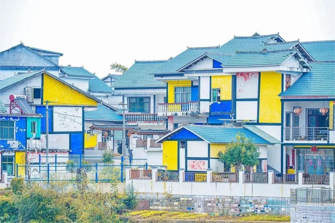 右二村非常具有特色的民居,外墙基本以黄、红、蓝为主色,植入了“蒙德里安”艺术元素,成功打造“蒙德里安小镇”。