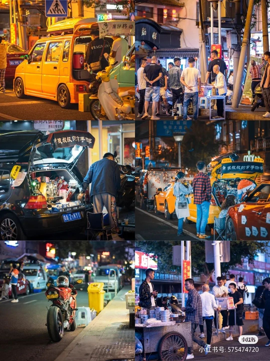 到了晚上还有后备箱集市。街道两边停靠着机车、跑车、后备箱咖啡……各种年轻人敏感的元素齐聚一堂,散发着浓浓的青春荷尔蒙。