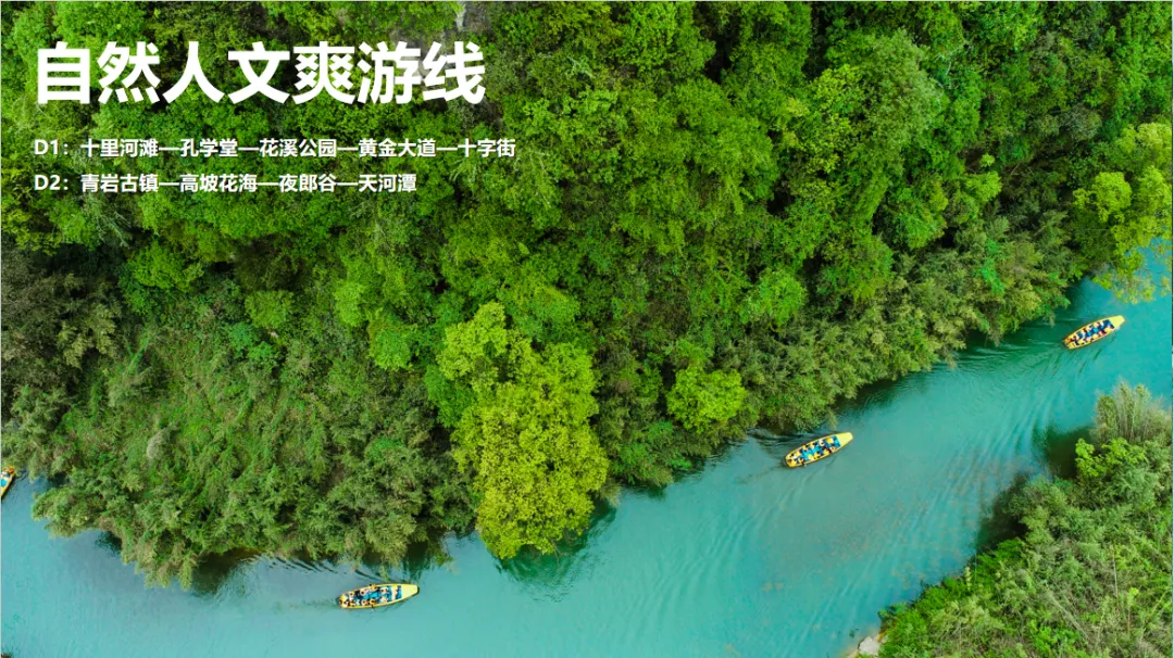 自然人文爽游线可尽享山水之灵秀,感受陈毅元帅盛赞的“真山真水到处是,花溪布局更天然。十里河滩明如镜,几步花圃几农田。”我们将带您游览十里河滩的清风盛夏,感悟孔学堂的儒学经典和阳明心学,在江南园林风格的花溪公园中,追忆历史,享受夏天的户外空调氧吧,漫步于凉风习习的黄金大道。午后阳光明媚时,乘船游览天河潭的山水溶洞,穿越历史神秘隧道,感受夜郎古国的垒石艺术和自然生态,带您穿梭青岩古镇的流光溢彩,在大明志活动中游遍青岩,欣赏地戏和花灯戏,享受别样的“六爽”体验。