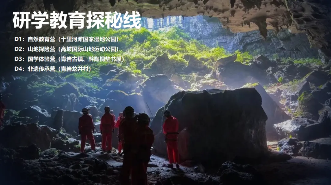 研学教育探秘线,非常适宜炎炎夏日放飞归家的神兽,让孩子们明白“文明其精神,野蛮其体魄”的奥义。我们提供丰富多样的研学项目,为莘莘学子们的暑假提供自然教育、山地探险、国学体验、非遗传承等丰富的探索与学习机会。自然教育营去观察湿地生态和鸟类活动,进行有趣的科学实验,实地感受书本中的生物知识。山地探险营通过攀岩、溯溪、探洞的户外运动项目,将学习到野外求生技巧,培养团队意识,磨砺自身意志。国学体验营将在国潮剧本杀,古楼寻宝等新奇的玩法中,在状元府、文昌阁的国学研习中,去领略中华文明的博大精深、非遗传承营主要学习蜡染、挑花等民俗手工艺,体验酿酒、打糍粑、推豆腐等传统作坊制作工艺,让学生们传承中华传统技艺。