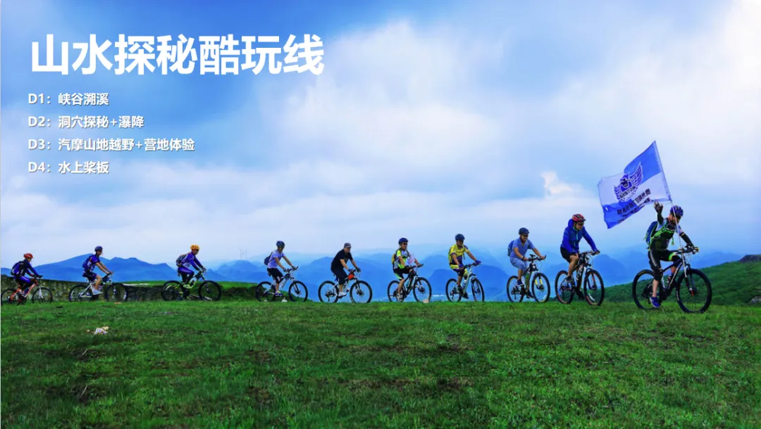 山水探秘酷玩线以酷、爽、潮、奇为特点,让您体验“探险孤峰解奥秘,寻奇暗洞释疑难”的惊险刺激。在红岩峡谷进行溯溪探险,欣赏高山深谷和奇峰怪石,在86米瀑降中释放压力,去探秘神秘洞堡的未知世界,我们还将进行汽摩山地越野活动和汽车场地越野赛,让您尽情释放速度与激情、最后,十里河滩水上运动让您足不出市就能体验到风靡夏威夷的桨板划行,在享受山水美景的同时,体验肾上腺素飙升的人板合一,让玩水的清凉冲淡夏天炽热的蝉鸣。