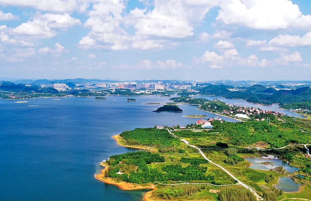 一面依山、三面环水,有龟岛、蛇岛、太阳岛等9个岛屿和2个码头,年平均气温18℃