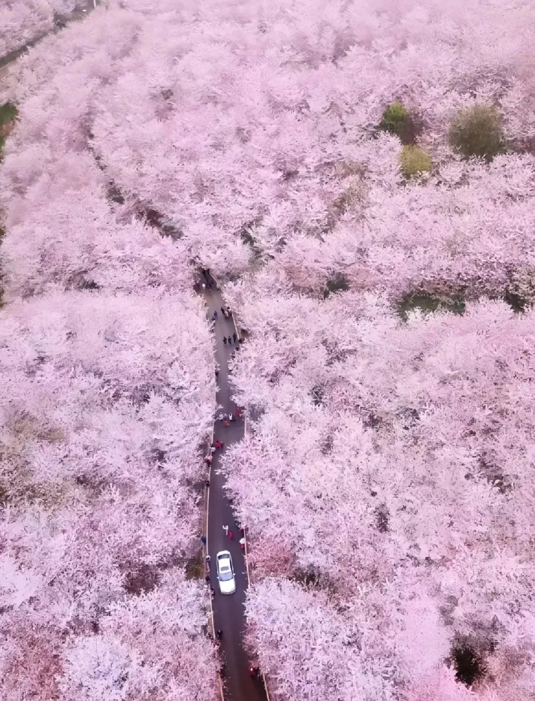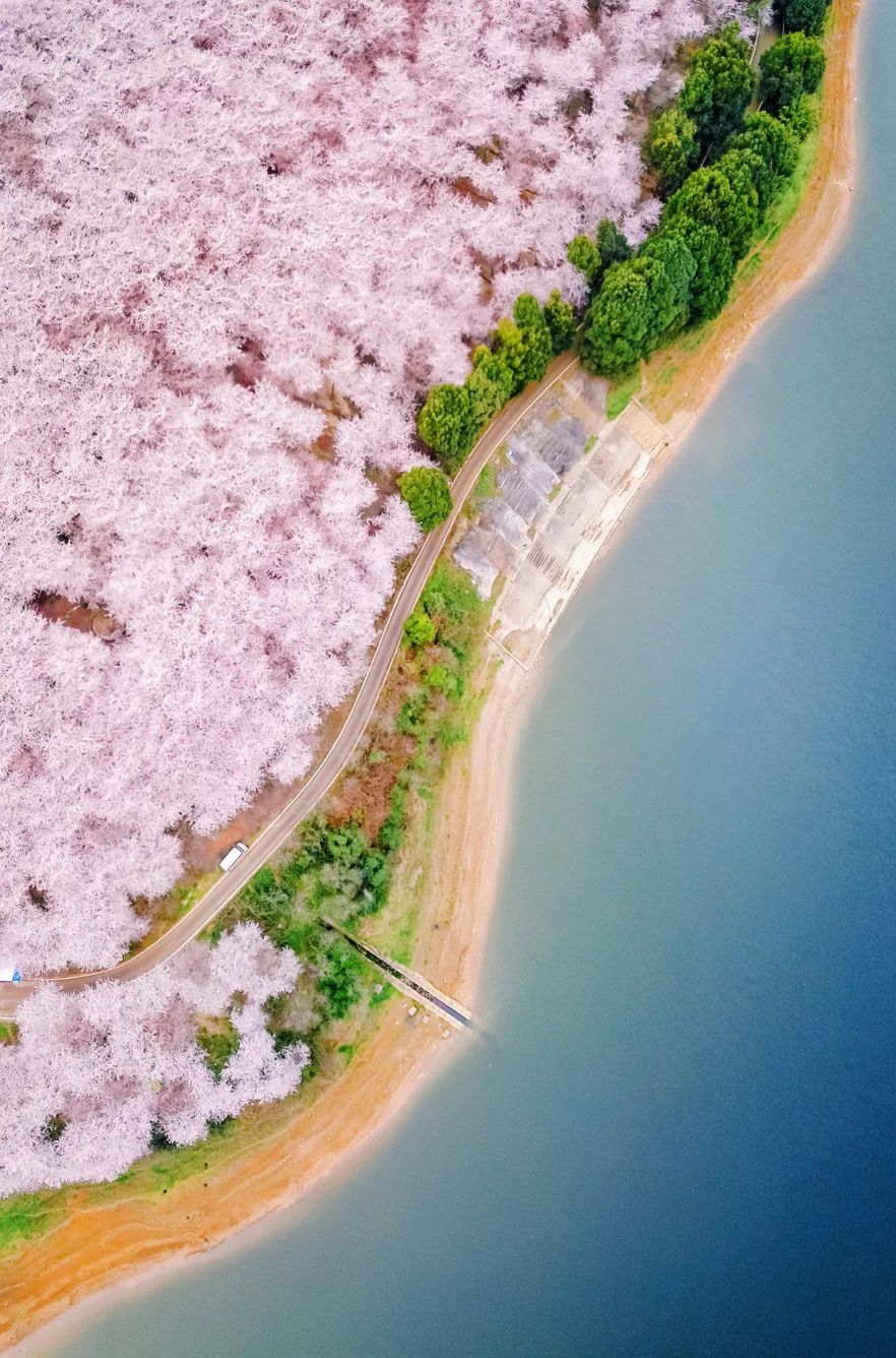 每年3月-4月,先是早樱品种-红樱盛开,然后是面积最大的粉白色樱花盛开,最后盛开的是晚樱品种-绯樱。届时,这片“世界最大”的樱花种植基地便化身为一片粉色樱花海,宛若世外桃源。