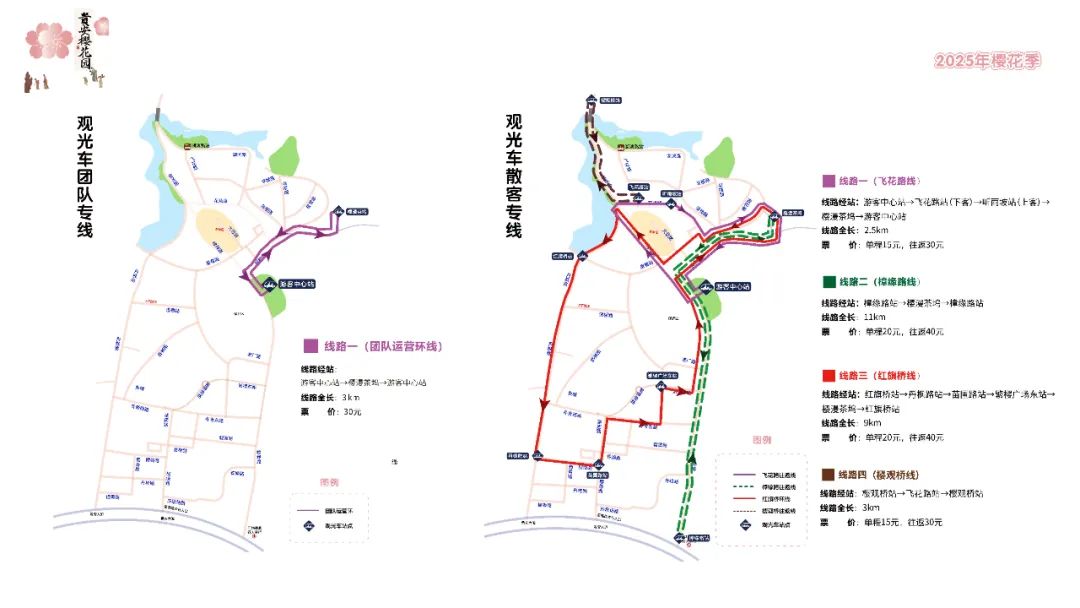 线路经站:游客中心→飞花路(下客)→听雨坡(上客)→樱漫茶坞→游客中心