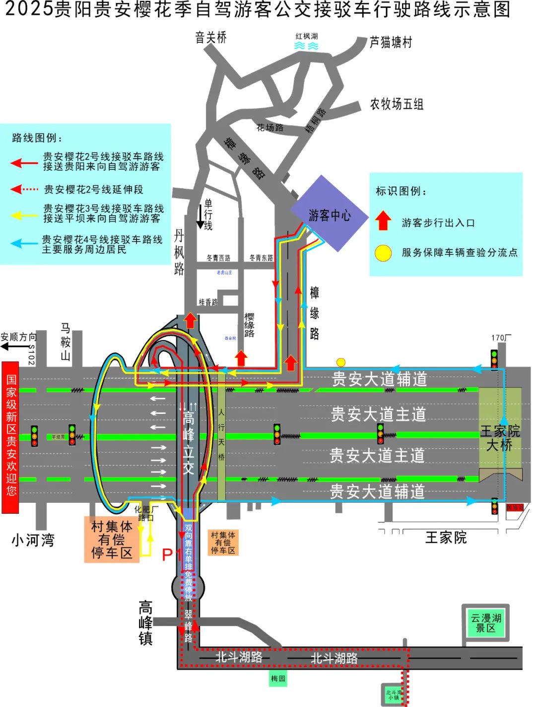 为保障游客顺畅出游、绿色出行,贵安高铁站开通了直达樱花园游客集散中心贵安樱花1号线,在高峰大道、贵安大道上的指定停车点开通了贵安樱花2、3、4号线,公交惠民票价2元/人次。
