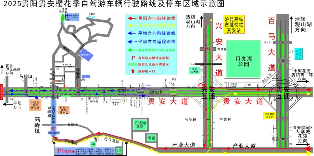 三、为贵阳、清镇、平坝三个主要方向的自驾游客制定了三条自驾赏樱路线。