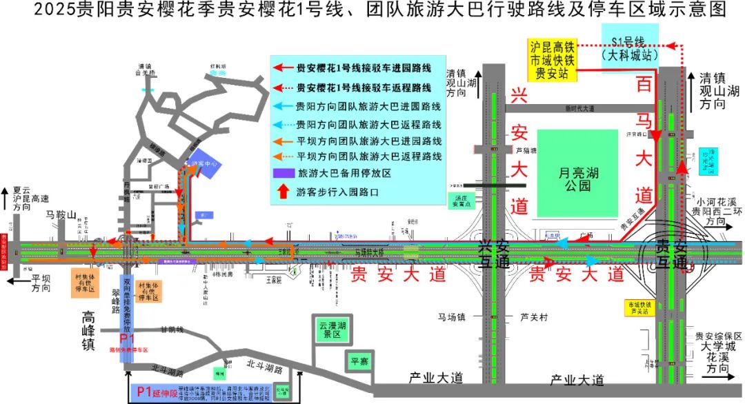 为打造“高效、便捷、绿色”的出行服务体系,今年的樱花季,我们在贵安高铁站开通了直达樱花园游客集散中心公交接驳路线【贵安樱花1号线:从贵安站(始发点)出发,途经大科城地铁站A口,最终抵达贵安樱花园游客集散中心】。