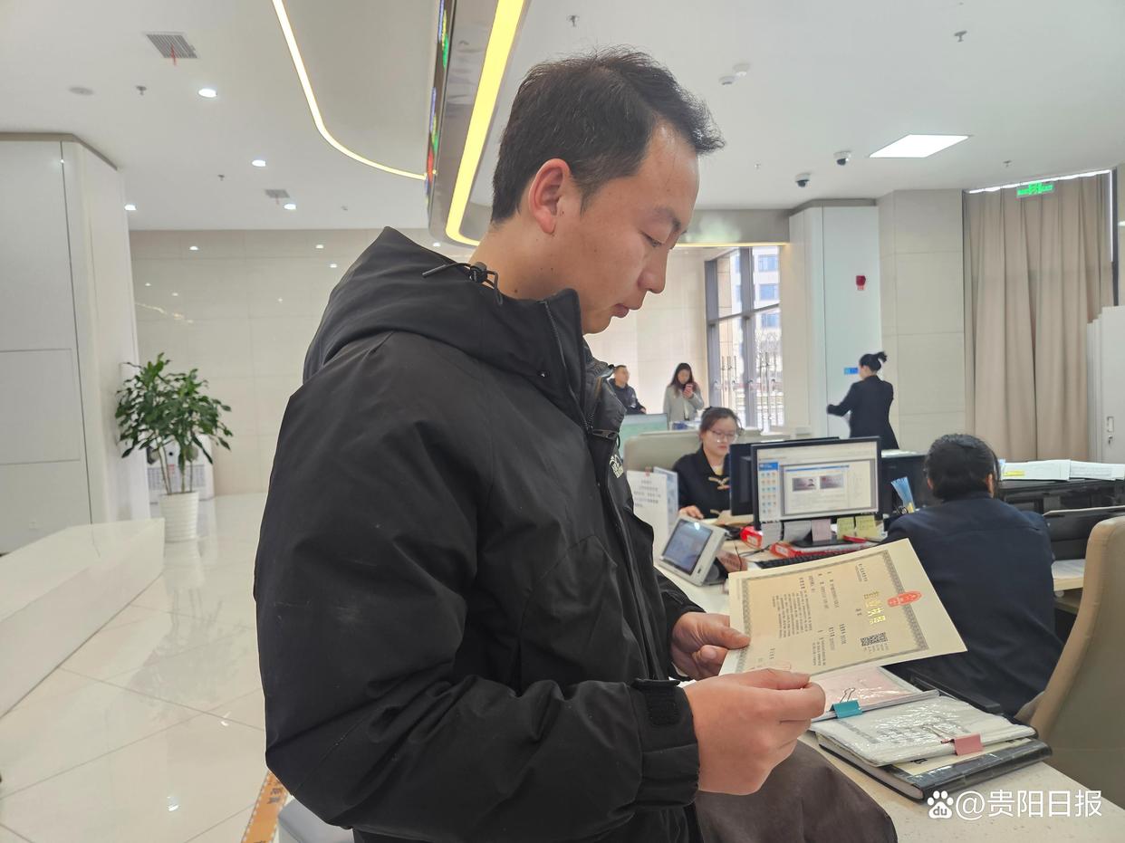 2月21日,在观山湖区政务大厅的法人区,企业代表张晓阳领取公章及营业执照时满脸笑意。