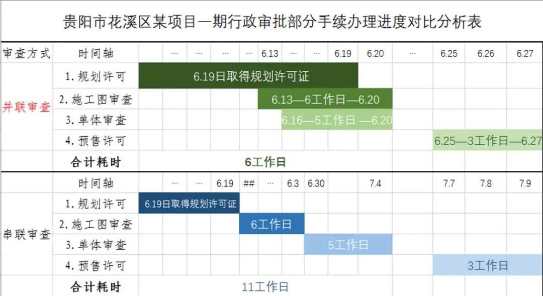 “并联审查”带来的效能提升立竿见影:建筑单体方案审查周期从7个工作日压缩至3-5个工作日。贵阳市花溪区某项目高效推进,正是得益于“并联审查”。贵阳市设质站(市抗震服务中心)在6月13日受理了施工图审查,于6月16日同步启动了建筑单体方案审查,6月20日双项审查结果同步出炉,全流程仅耗时6个工作日,较传统串联审查模式节省了11个工作日!这不仅为项目开工争取了宝贵时间,更有效降低企业时间成本和资金周转压力。