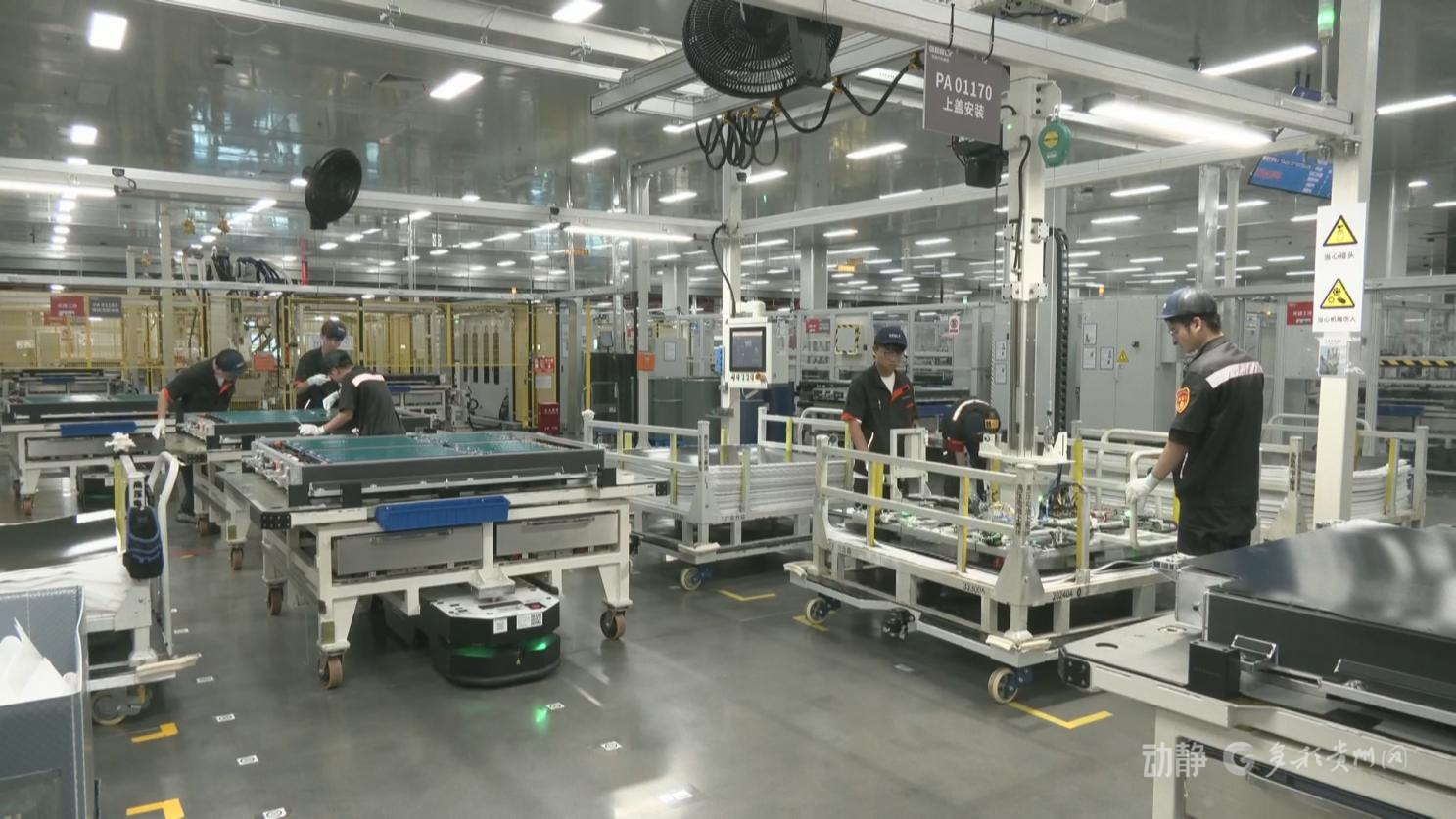 在贵阳这家从事新能源车电池生产的企业,自动化生产线正高速运转。电池产品不断下线。据介绍,车间的电池从生产到整车装配仅需4.5小时,每2分钟便可产出一个电池包。依托吉利贵阳制造基地的带动,公司电池包年产量约18万套,今年上半年产值超8亿元。