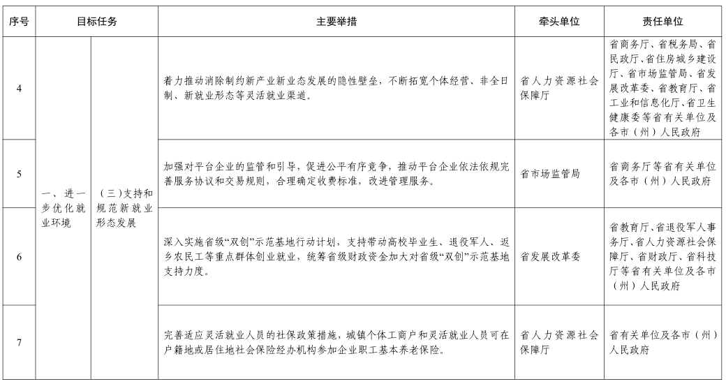 (三)支持和规范新就业形态发展。着力推动消除制约新产业新业态发展的隐性壁垒,不断拓宽个体经营、非全日制、新就业形态等灵活就业渠道。加强对平台企业的监管和引导,促进公平有序竞争,推动平台企业依法依规完善服务协议和交易规则,合理确定收费标准,改进管理服务。深入实施省级“双创”示范基地行动计划,支持带动高校毕业生、退役军人、返乡农民工等重点群体创业就业,统筹省级财政资金加大对省级“双创”示范基地支持力度。完善适应灵活就业人员的社保政策措施,城镇个体工商户和灵活就业人员可在户籍地或居住地社会保险经办机构参加企业职工基本养老保险。
