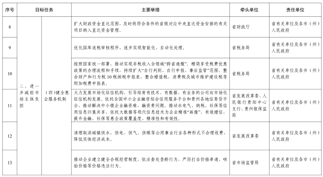 (四)健全惠企服务机制。扩大财政资金直达范围,及时将符合条件的省级对应中央直达资金安排的有关项目纳入直达资金管理。优化国库退税审核程序,逐步实现智能化、自动化处理。按照国家统一部署,推动实现非税收入全领域“跨省通缴”。精简享受税费优惠政策的办理流程和手续,持续扩大“自行判别、自行申报、事后监管”范围。整合财产和行为税10税纳税申报表,整合增值税、消费税及城市维护建设税等附加税费申报表。大力发展市场化征信机构,引导培育有技术、有数据、有业务的公司向市场化征信机构发展。依托全国中小企业融资综合信用服务平台和贵州各地信易贷平台,推动解决中小微企业融资难、融资贵问题。推动水电气、纳税、社保等信用信息归集共享,依托大数据等现代信息技术为企业精准“画像”、有效增信,提升金融、社保等惠企政策覆盖度、精准性和有效性。清理取消城镇供水、供电、供气、供暖等公用事业行业各种形式不合理收费,降低实体经济成本。推动企业建立健全合规经营制度,依法查处垄断行为,严厉打击价格串通、哄抬价格等价格违法行为。深入开展“千企面对面”科技服务行动,加大企业科技供给。
