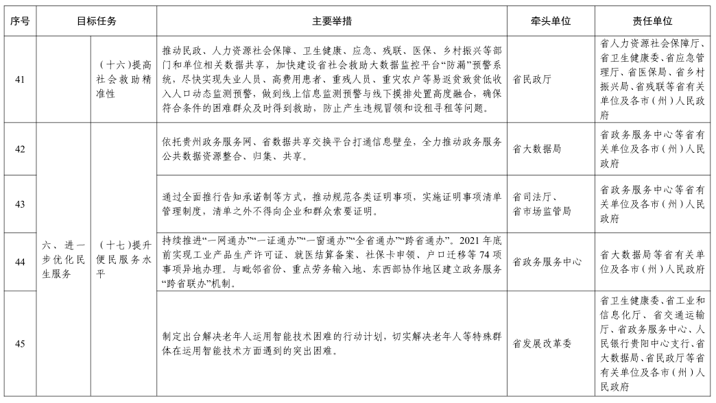 (十七)提升便民服务水平。依托贵州政务服务网、省数据共享交换平台打通信息壁垒,全力推动政务服务公共数据资源整合、归集、共享。通过全面推行告知承诺制等方式,推动规范各类证明事项,实施证明事项清单管理制度,清单之外不得向企业和群众索要证明。持续推进“一网通办”“一证通办”“一窗通办”“全省通办”“跨省通办”。2021年底前实现工业产品生产许可证、就医结算备案、社保卡申领、户口迁移等74项事项异地办理。与毗邻省份、重点劳务输入地、东西部协作地区建立政务服务“跨省联办”机制。制定出台解决老年人运用智能技术困难的行动计划,切实解决老年人等特殊群体在运用智能技术方面遇到的突出困难。