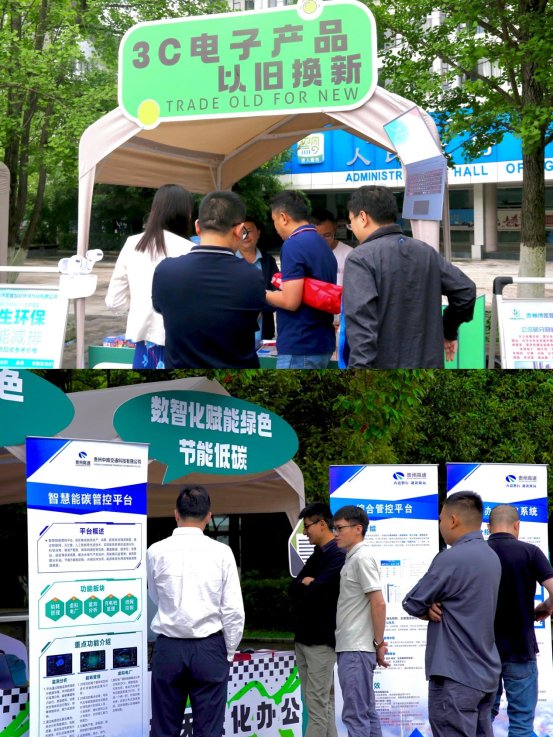 旧物新生,绿色为引践行循环理念。6月23日至29日期间,贵阳市市直机关事务管理局在市级行政中心西南美食广场举行废旧3C电子产品回收/旧物兑换活动,活动引入专业回收企业,鼓励市民将闲置或废旧的3C产品、杂志、纸壳、报纸、塑料瓶等物品进行回收,以积分兑换的形式反补可降解垃圾袋、办公用品、会议用水、环保用纸、其他个性化等物品。展区还设置智慧能碳管控平台展陈、低碳无纸化办公展陈以及无纸化办公会议系统展示,让市民了解前沿节能科技与办公方式。