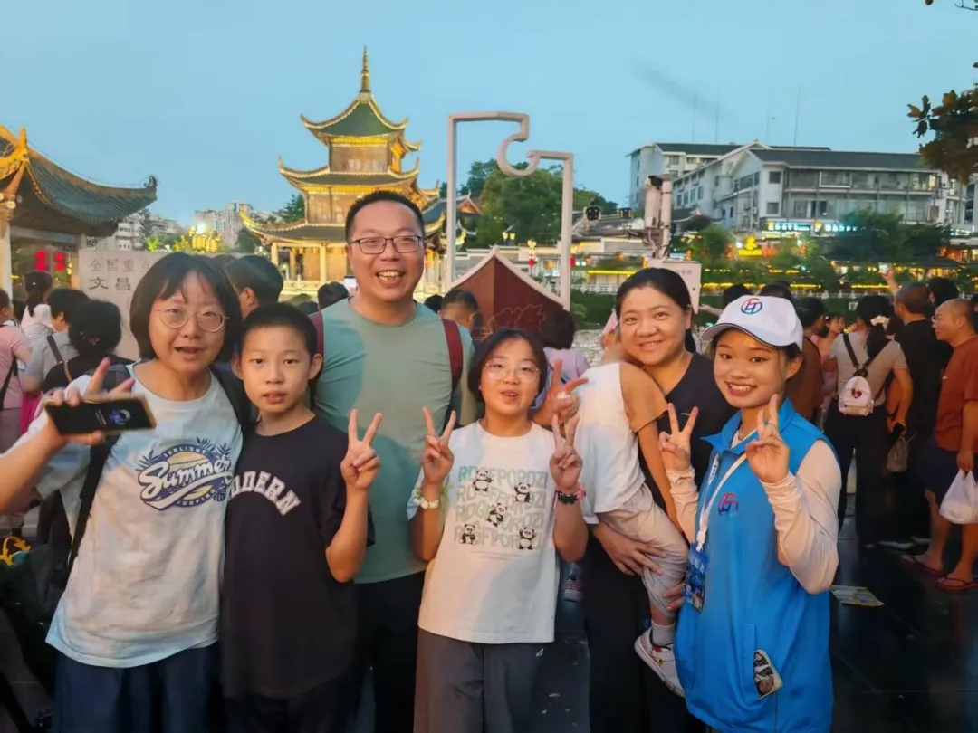 甲秀楼前,“小青爽”热情为山西游客一家讲解古楼历史,并邀请游客合影留念。镜头定格,青春笑脸与飞檐翘角交相辉映,留下贵阳最温情的瞬间。