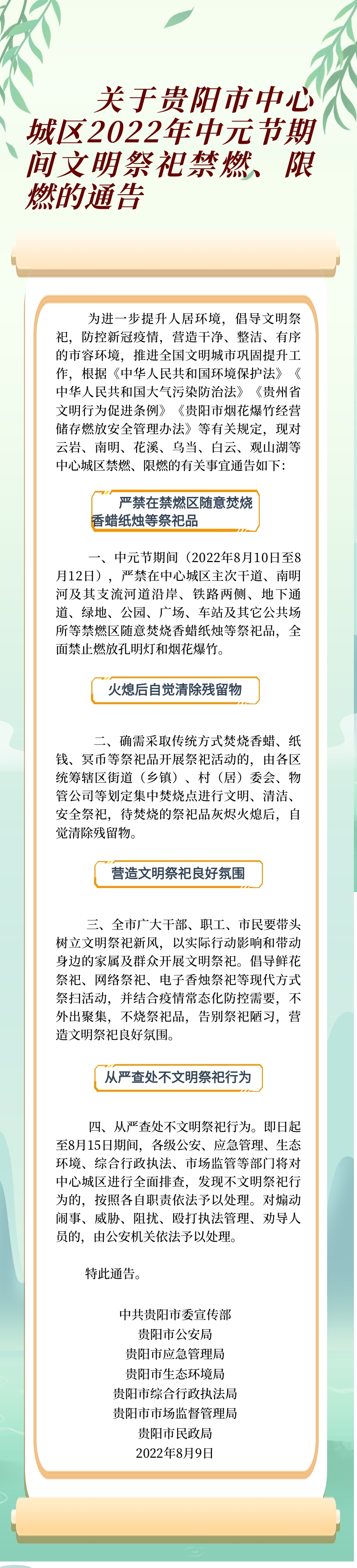 关于贵阳市中心城区2022年中元节期间文明祭祀禁燃、限燃的通告