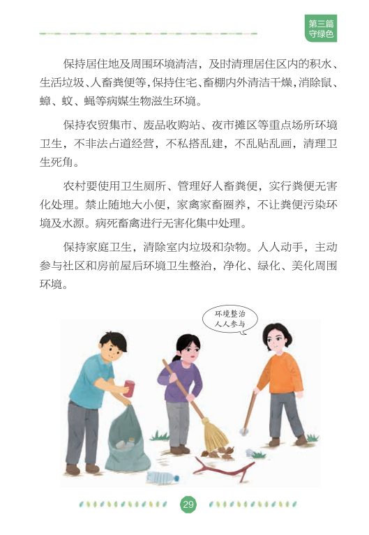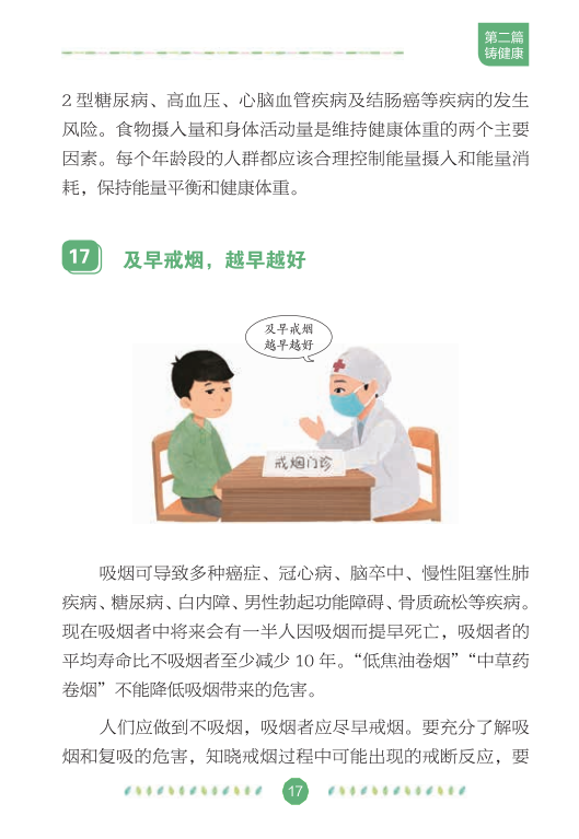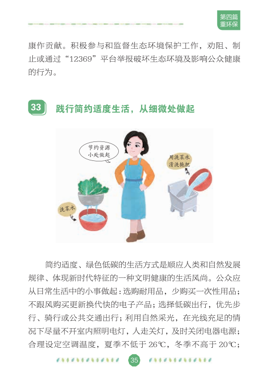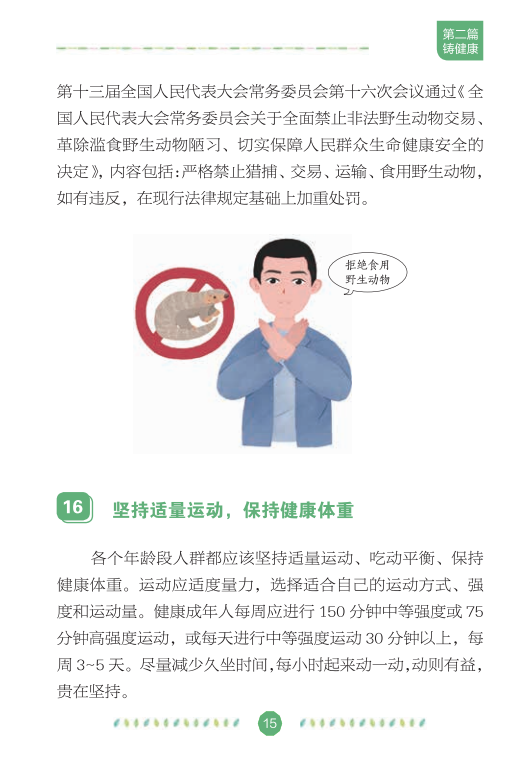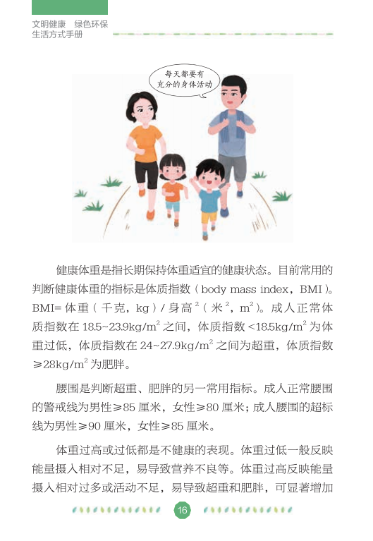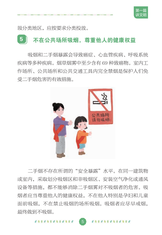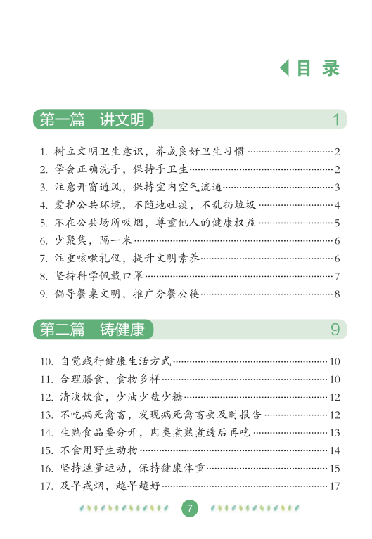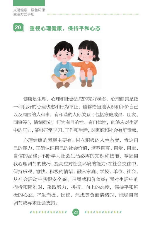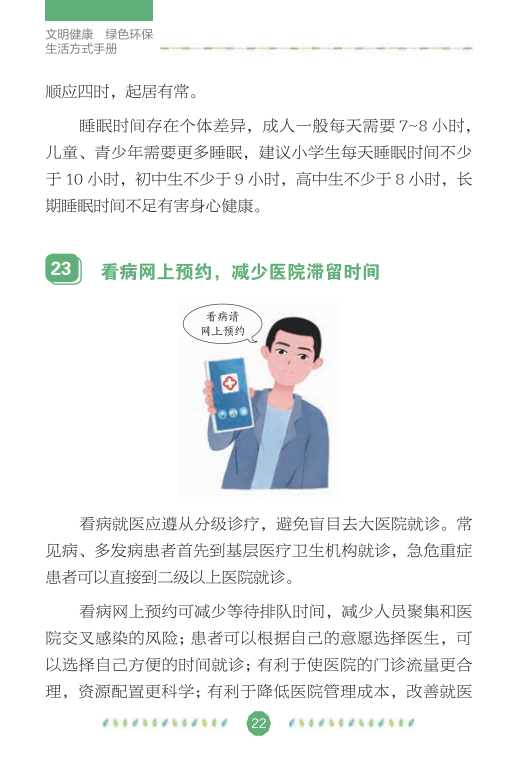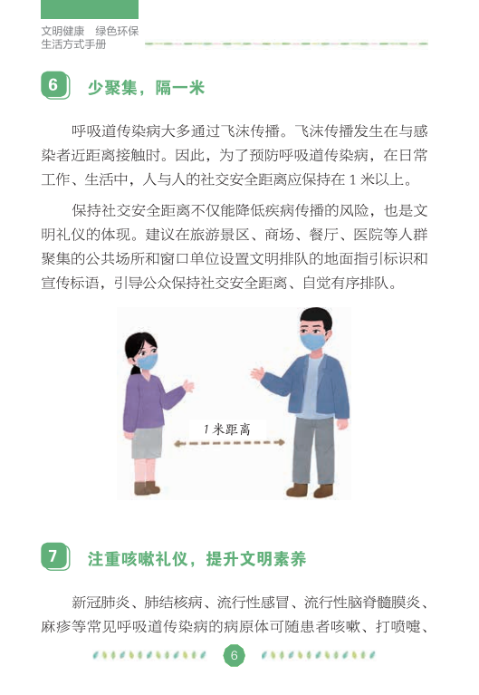 在全国爱卫办、中央文明办、健康中国行动推进办的指导下,中国健康教育中心组织专家编写了《文明健康绿色环保生活方式手册》,分别从讲文明、铸健康、守绿色、重环保4个角度,向公众介绍如何在日常生活、工作和学习中积极践行文明健康、绿色环保的生活方式,切实增强公众的节约意识、环保意识和生态意识,维护自己和家人的健康,实现可持续发展。