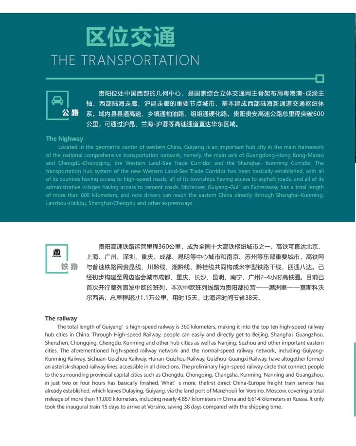 贵阳高速铁路运营里程360公里,成为全国十大高铁枢纽城市之一。高铁可直达北京、上海、广州、深圳、重庆、成都、昆明等中心城市和南京、苏州等东部重要城市,高铁网与普速铁路网贵昆线、川黔线、湘黔线、黔桂线共同构成米字型铁路干线,四通八达。已 经初步构建至周边省会城市成都、重庆、长沙、昆明、南宁、广州2-4小时高铁圈。目前已首次开行整列直发中欧的班列,本次中欧班列线路为贵阳都拉营--满洲里--莫斯科沃尔西诺,总里程超过1.1万公里,用时15天,比海运时间节省38天。