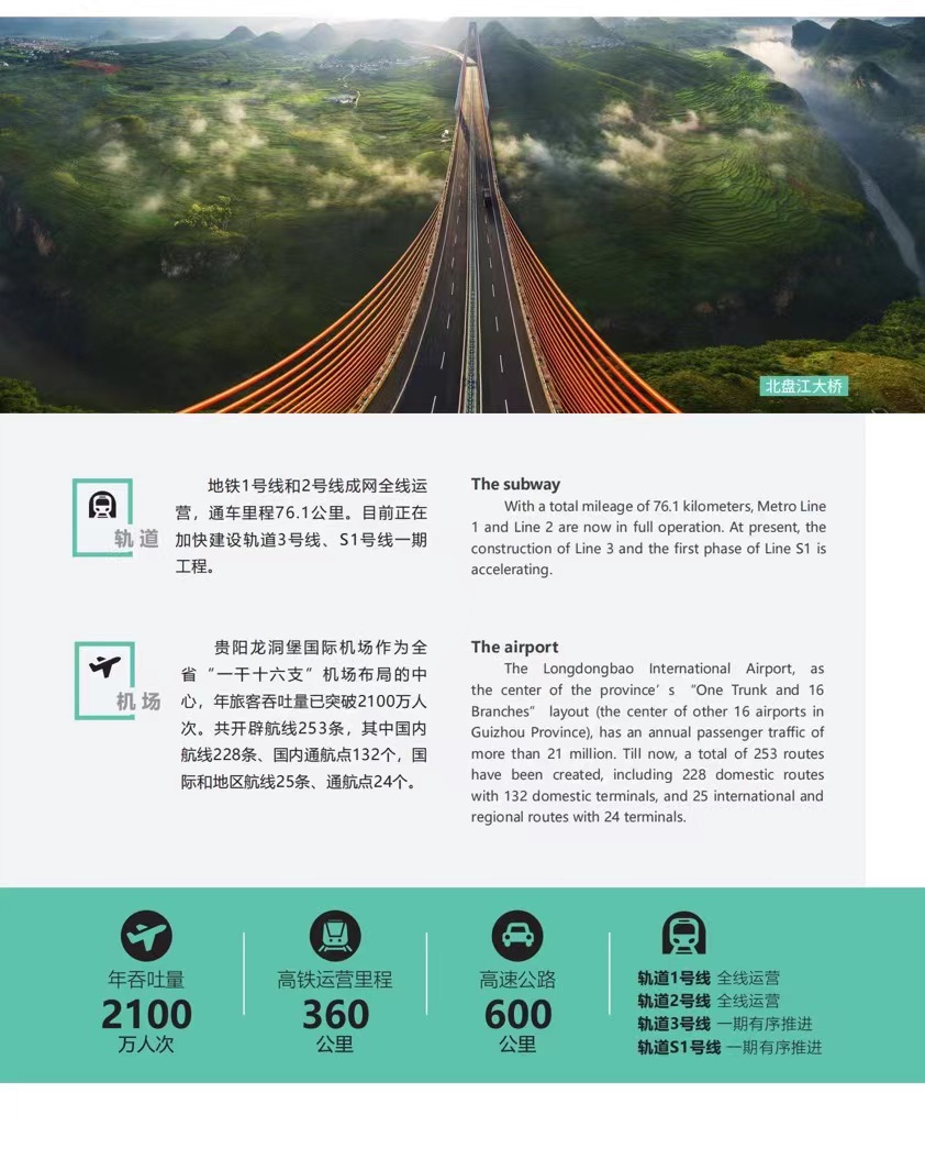贵阳位处中国西部的几何中心,是国家综合立体交通网主骨架布局粤港澳-成渝主轴、西部陆海走廊、沪昆走廊的重要节点城市,基本建成西部陆海新交通枢纽体系。域内县县通高速、乡镇通柏油路、组织同硬化路。贵阳贵安高速公路历程突破600公里,可通过沪昆、兰海-沪蓉等高速通道直达华东区域。