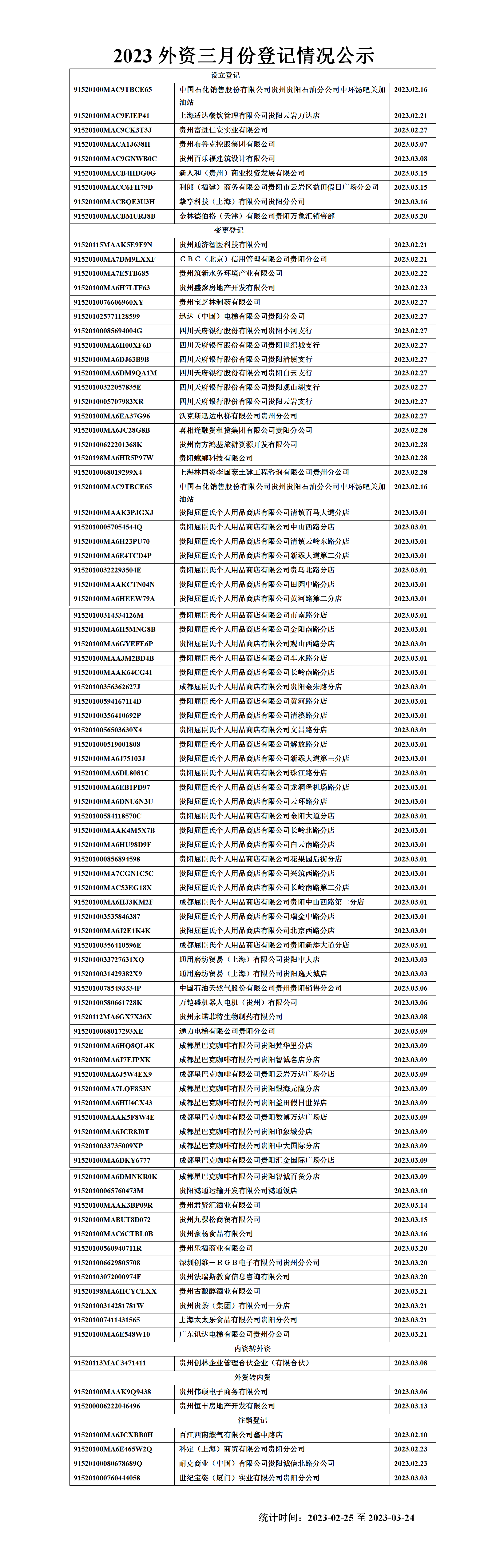贵阳市2023年度外资三月份登记情况公示,具体情况如下: