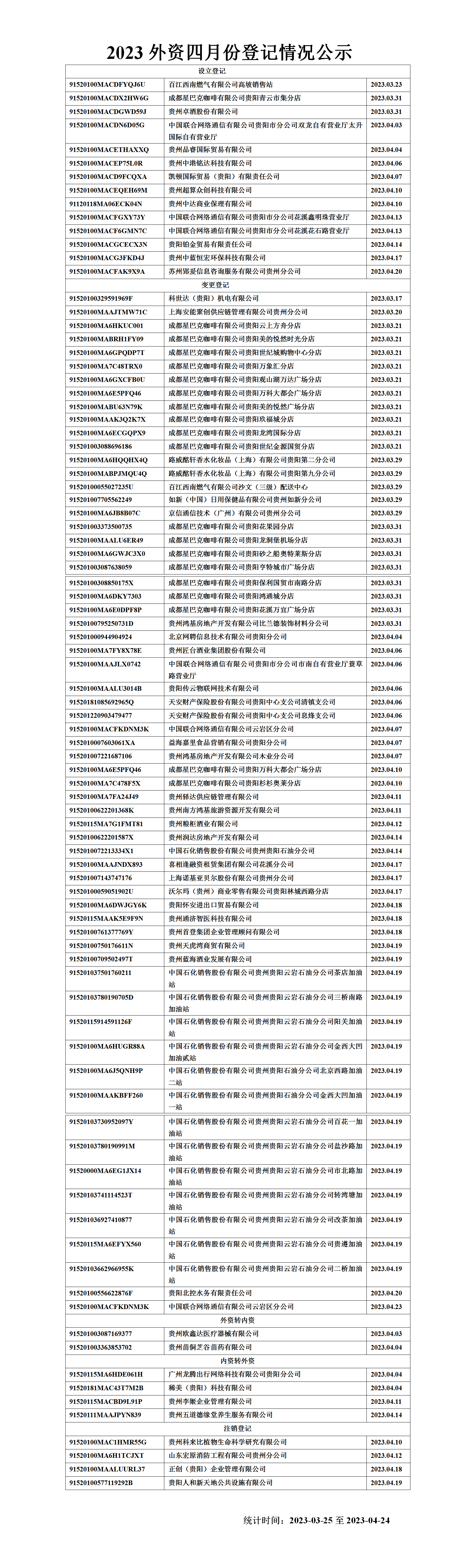贵阳市2023年度外资四月份登记情况公示,具体情况如下: